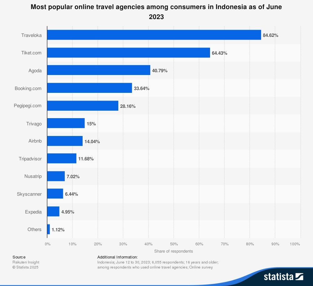 Indonesia’s OTA sector is widely recognized as being dominated by two major players: Traveloka and Tiket.com. Both offer comprehensive service ecosystems, strong brand recognition, and direct access to airline, hotel, and attraction inventories.