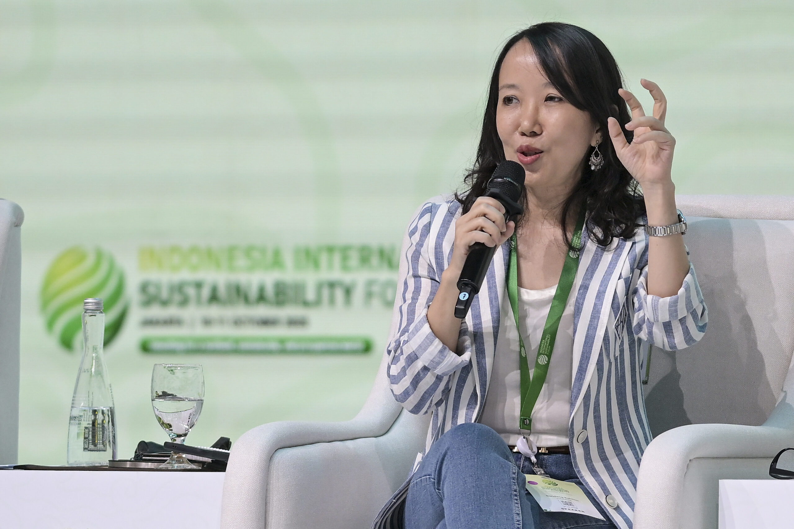 Human Resources Director of Schneider Electric Indonesia and Timor-Leste, Sondang Saktion, delivers a presentation during a panel session at the Indonesia International Sustainability Forum (ISF) 2025 at the Jakarta International Convention Center (JICC), Jakarta, Saturday (October 11, 2025).