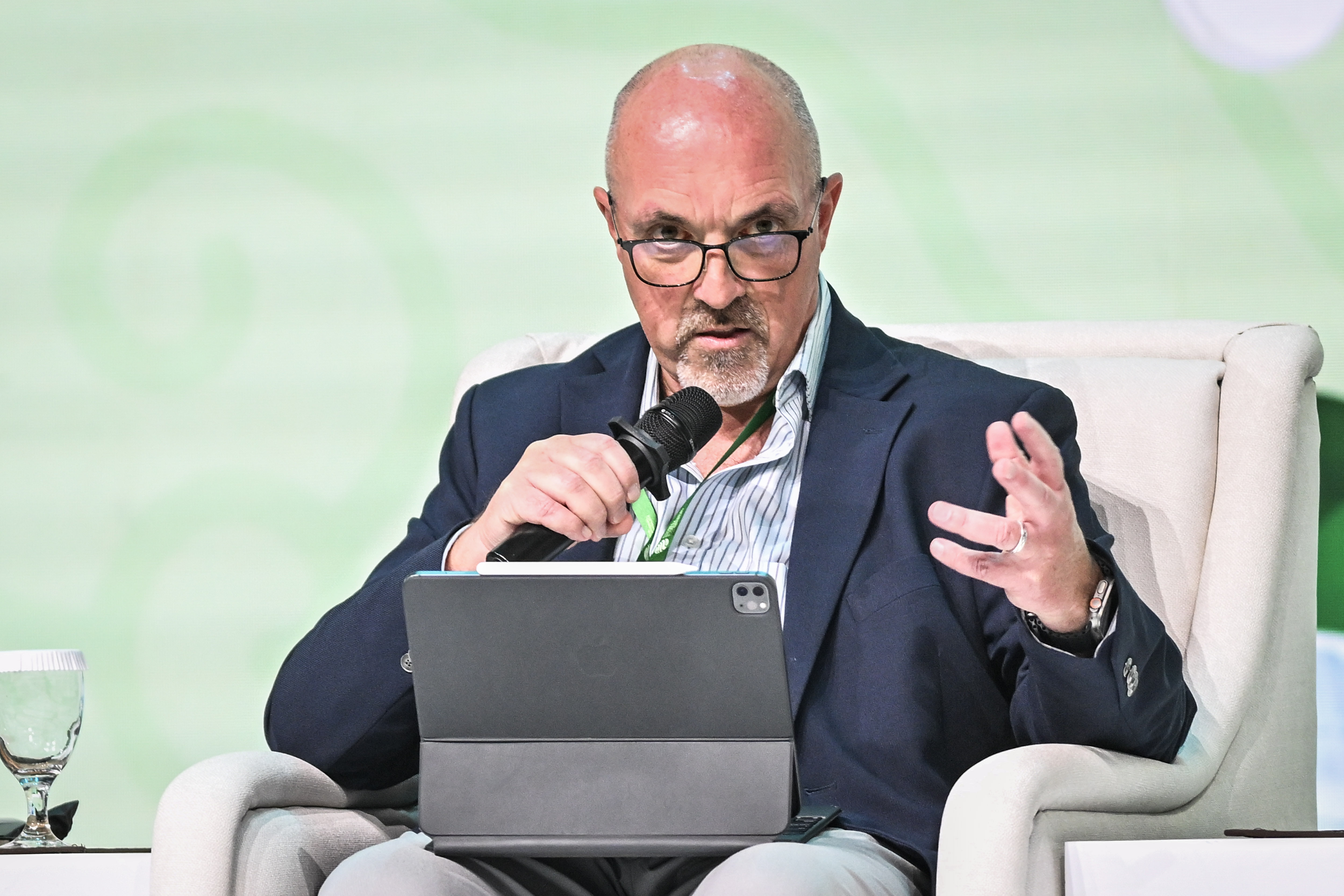 Professor of Microbiology at the University of California, Berkeley, John Coates, speaks during the panel session on advancing industrial decarbonization at the Indonesia International Sustainability Forum (ISF) 2025 at the Jakarta International Convention Center (JICC), Jakarta, Saturday (October 11, 2025).