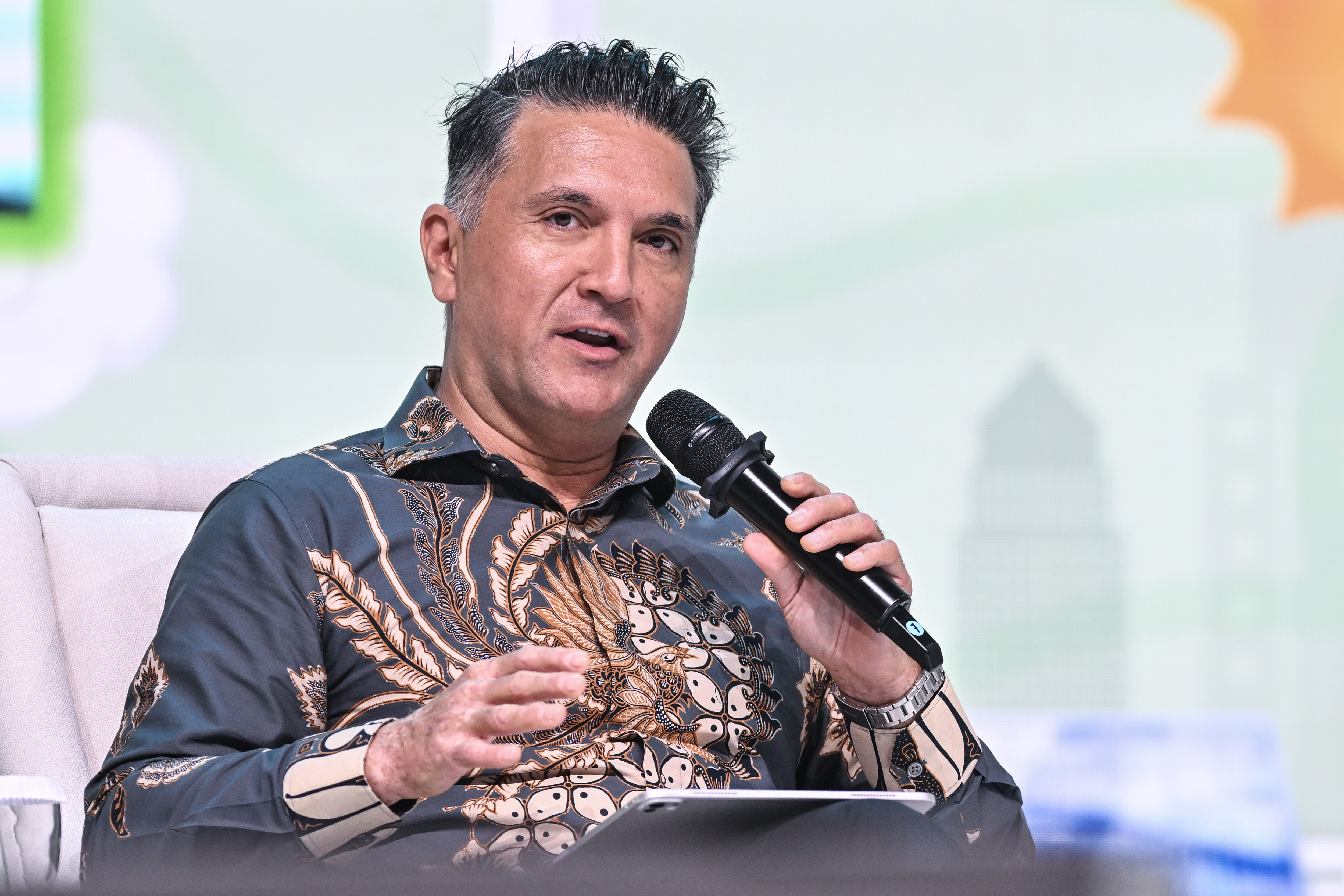 Professor of Microbiology at the University of California, Berkeley, John Coates, speaks during the panel session on advancing industrial decarbonization at the Indonesia International Sustainability Forum (ISF) 2025 at the Jakarta Convention Center (JCC), Jakarta, Saturday (October 11, 2025).