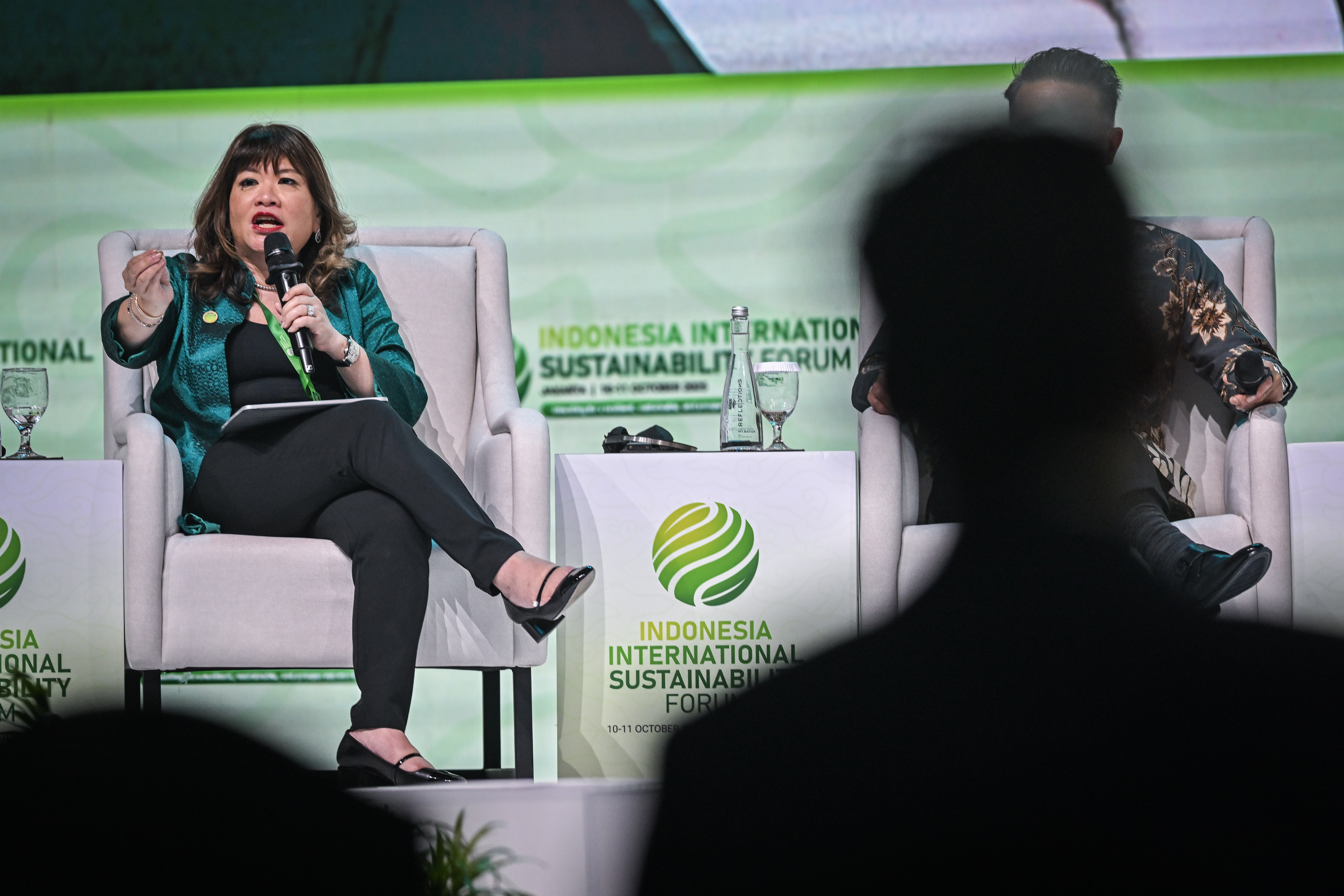 Adidas Senior Director of Procurement Sustainability, Karen Chan, speaks during the panel session on advancing industrial decarbonization at the Indonesia International Sustainability Forum (ISF) 2025 at the Jakarta International Convention Center (JICC), Jakarta, Saturday (October 11, 2025).