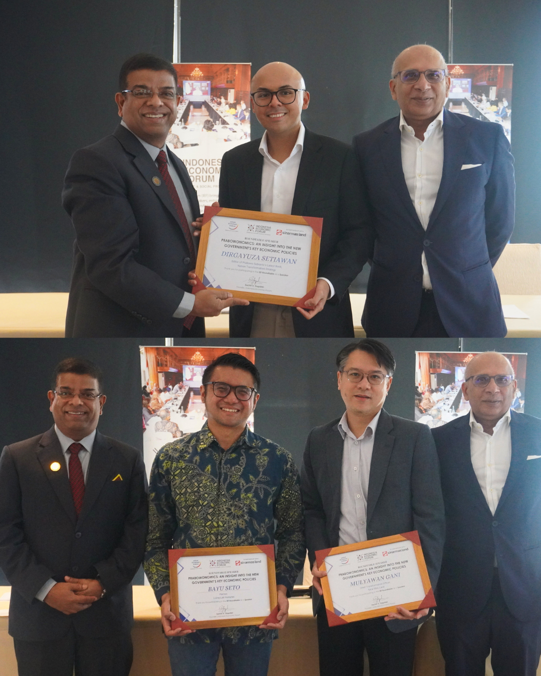 Top, From Left to Right: Sachin V. Gopalan, Founder & CEO of Indonesia Economic Forum; Dirgayuza Setiawan, Editor of Prabowo’s Latest Book, Nation Transformation Strategy; Shoeb Kagda, Director of Singapore Management University